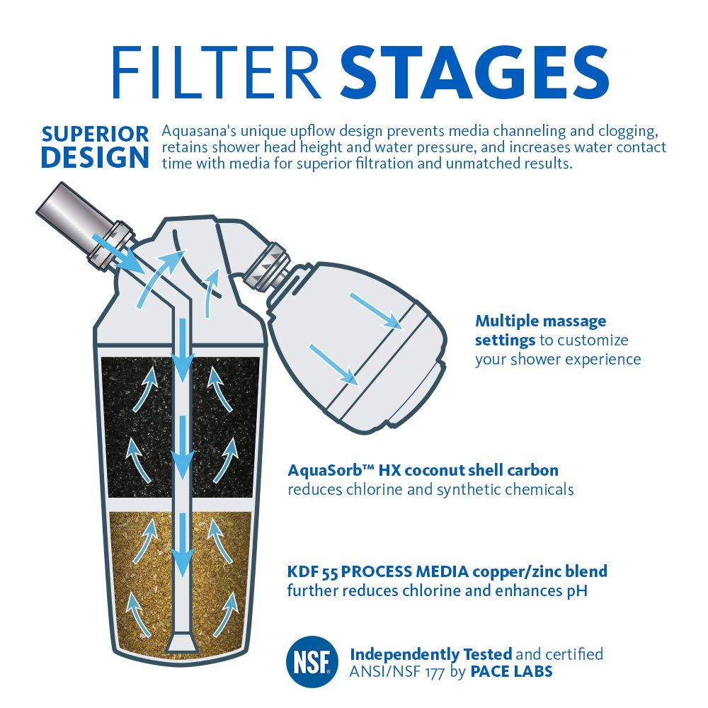 Vandopløseligt klorid er godartet og fjerner ikke de naturlige, beskyttende olier og protein fra håret. Det udvikler sig heller ikke til giftig damp i badet. Derudover bruger Aquasana aktivt kul fremstillet af kokosnød til at filtrere syntetiske kemikalier og reducere klor yderligere.